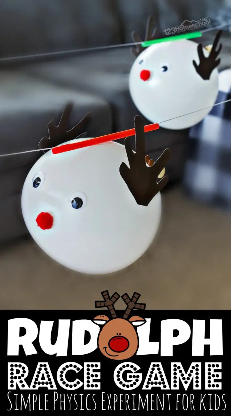 This fun Rudolph Race Game is both an outrageously fun Christmas game for kids and a chance to sneak in Christmas STEM Activities! This easy-to-set-up Rudolph Races is a Christmas Activity.